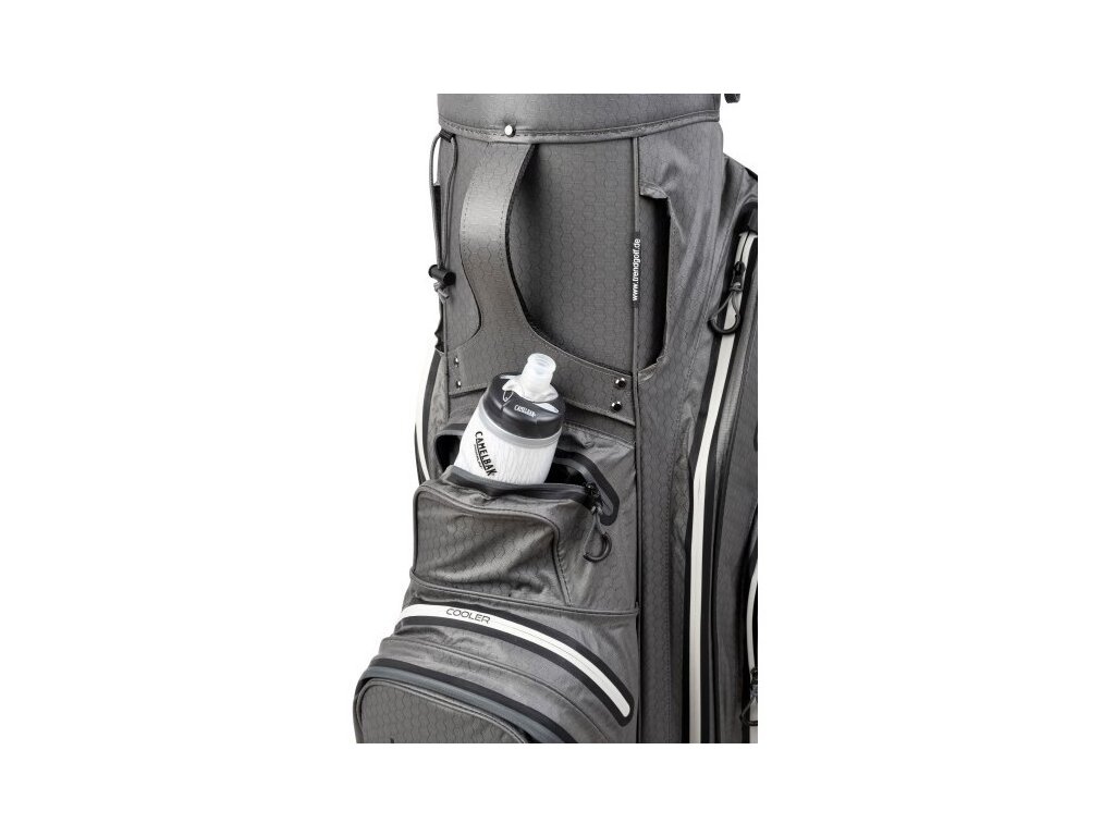 Golfový bag Silent s 9 praktickými kapsami zaujme vrchním organizérem s jednotlivými komorami na hole, díky kterým nedochází k narážení holí během jízdy vozíku.